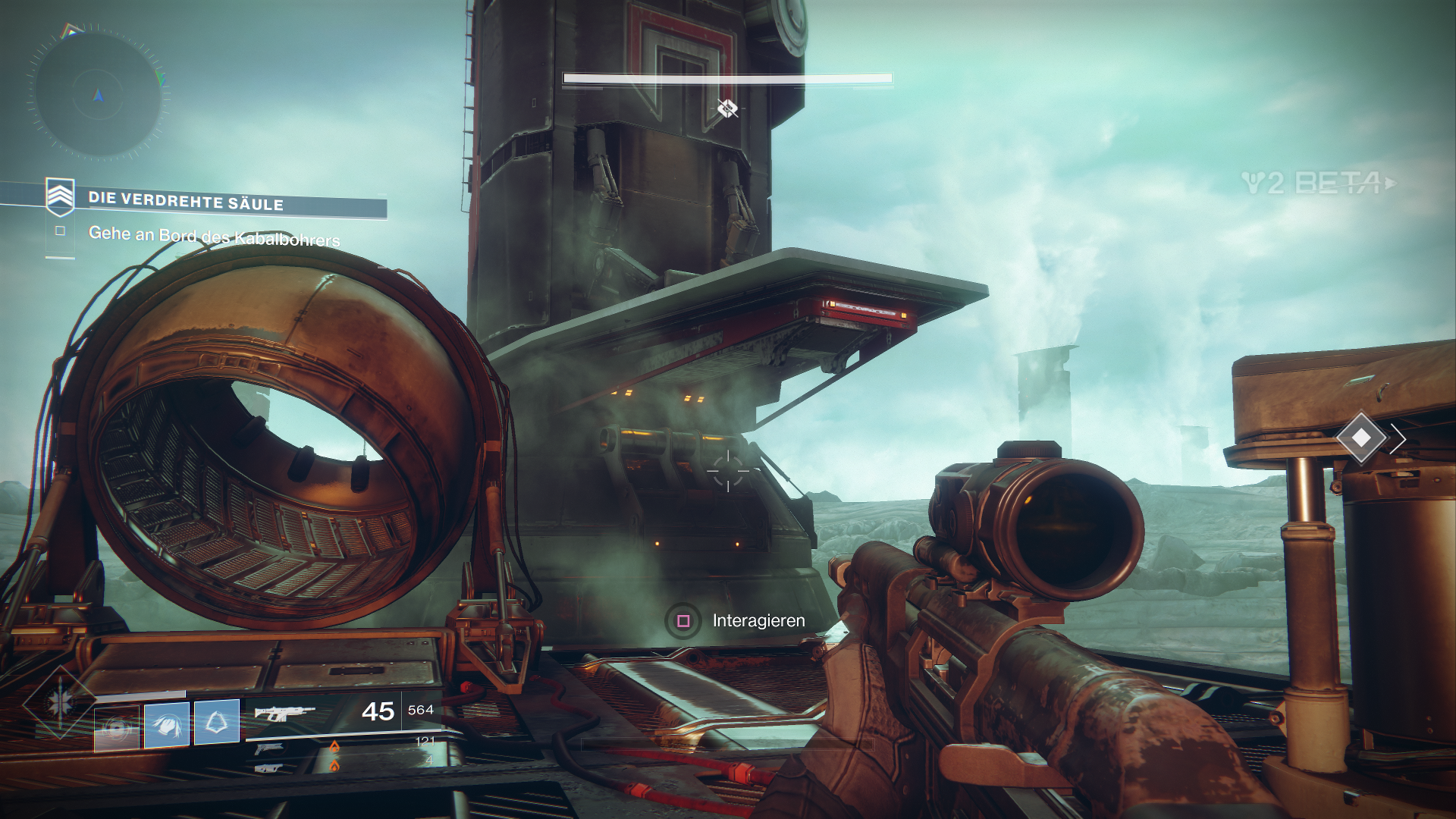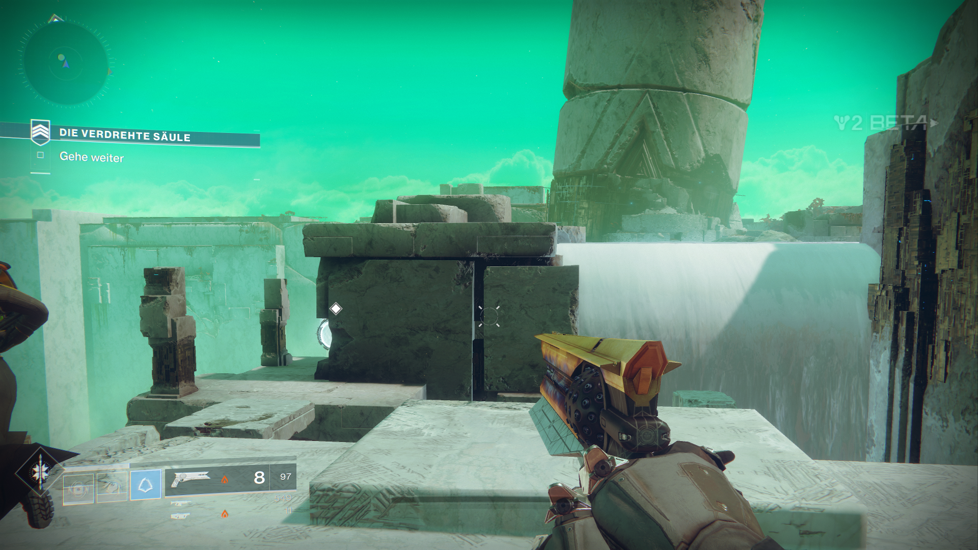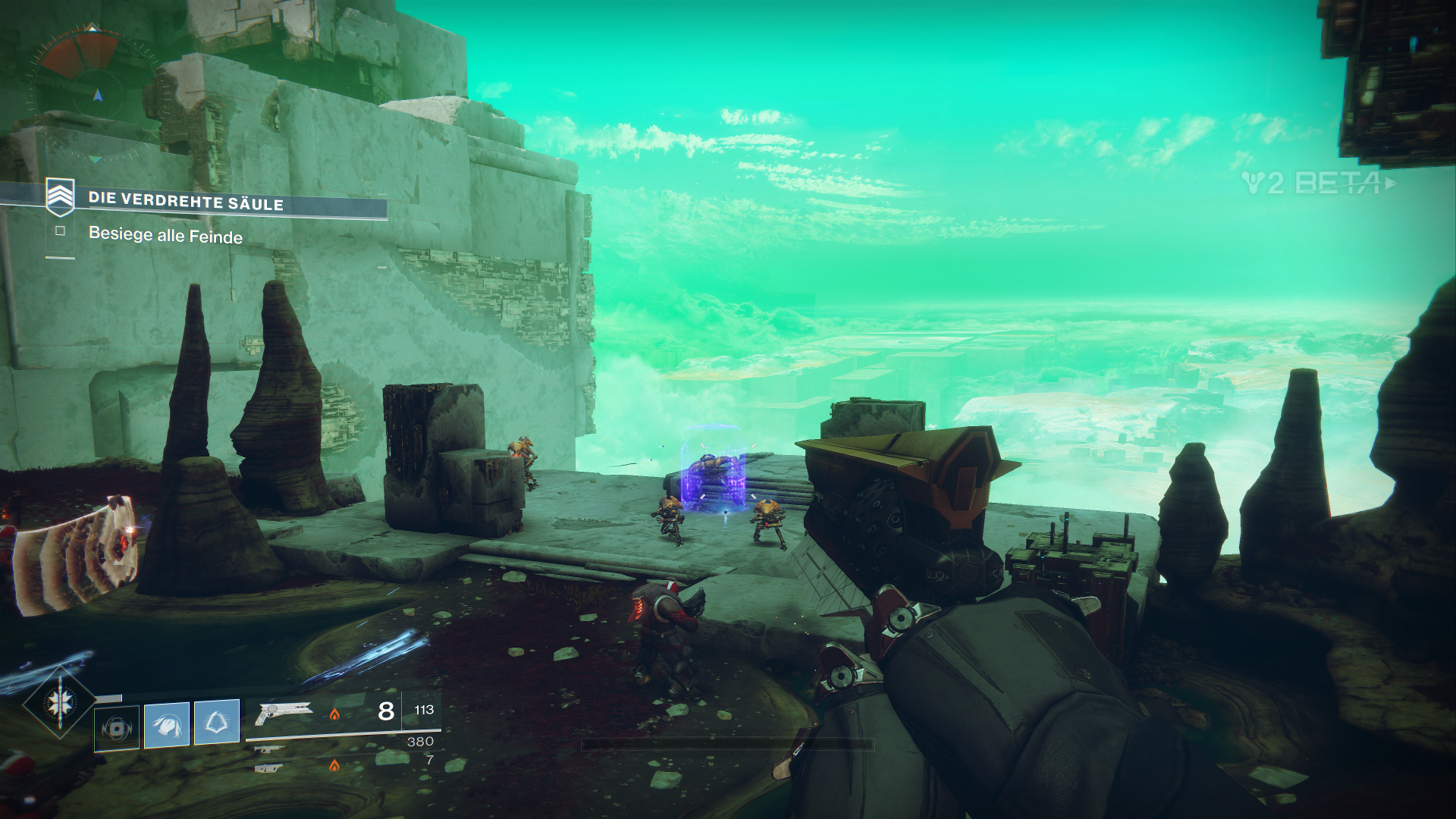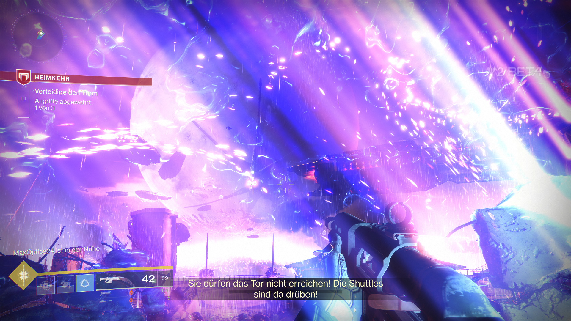 Außerdem dürfen wir innerhalb der Beta auch schon mal drei neue exotische Waffen ausprobieren, als Hunter den Sonnenschuss, einen Revolver. Zudem fällt direkt erst mal das neue Waffen-System auf, welches uns erlaubt, sogenannte Energiewaffen zu nutzen. Das sind normale Waffen, welche Elementarschaden anrichten. Zudem bekommen wir als Powerwaffe sogar einen der neuen Granatwerfer in die Hand gedrückt.
