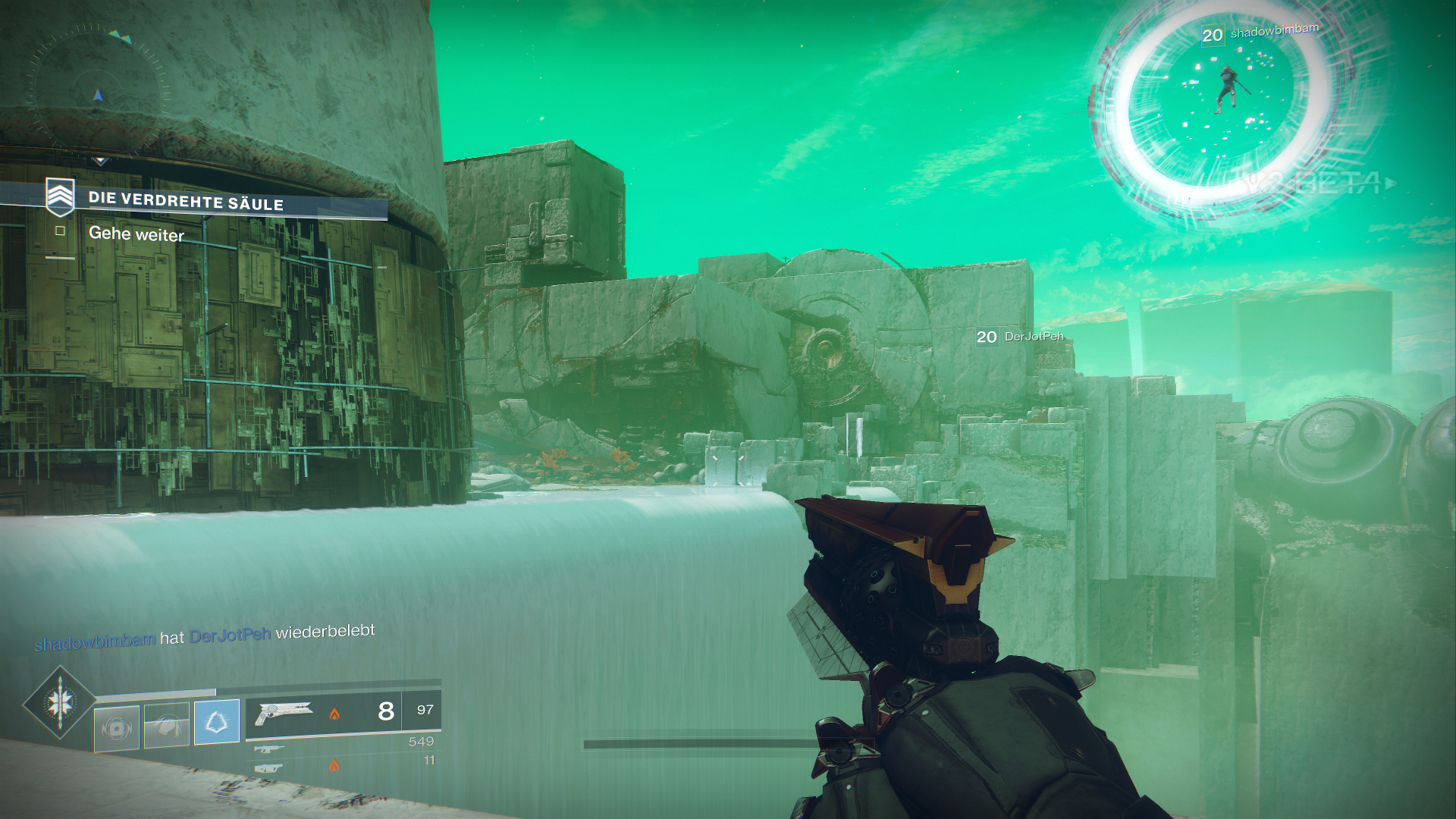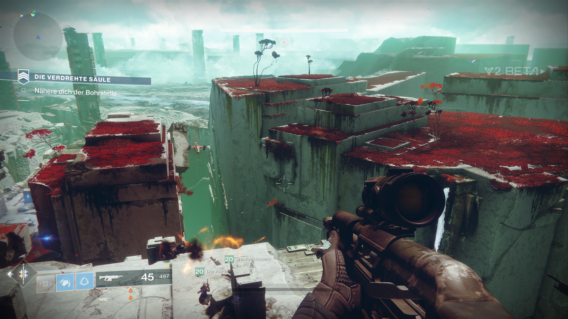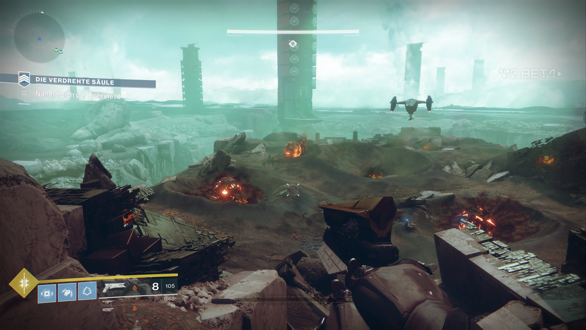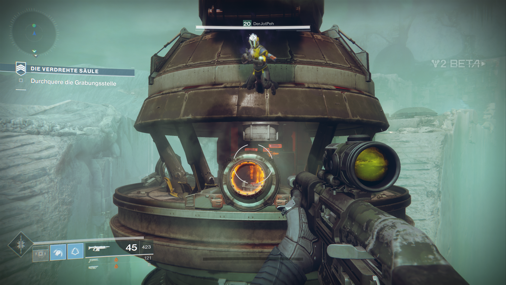 Außerdem dürfen wir innerhalb der Beta auch schon mal drei neue exotische Waffen ausprobieren, als Hunter den Sonnenschuss, einen Revolver. Zudem fällt direkt erst mal das neue Waffen-System auf, welches uns erlaubt, sogenannte Energiewaffen zu nutzen. Das sind normale Waffen, welche Elementarschaden anrichten. Zudem bekommen wir als Powerwaffe sogar einen der neuen Granatwerfer in die Hand gedrückt.