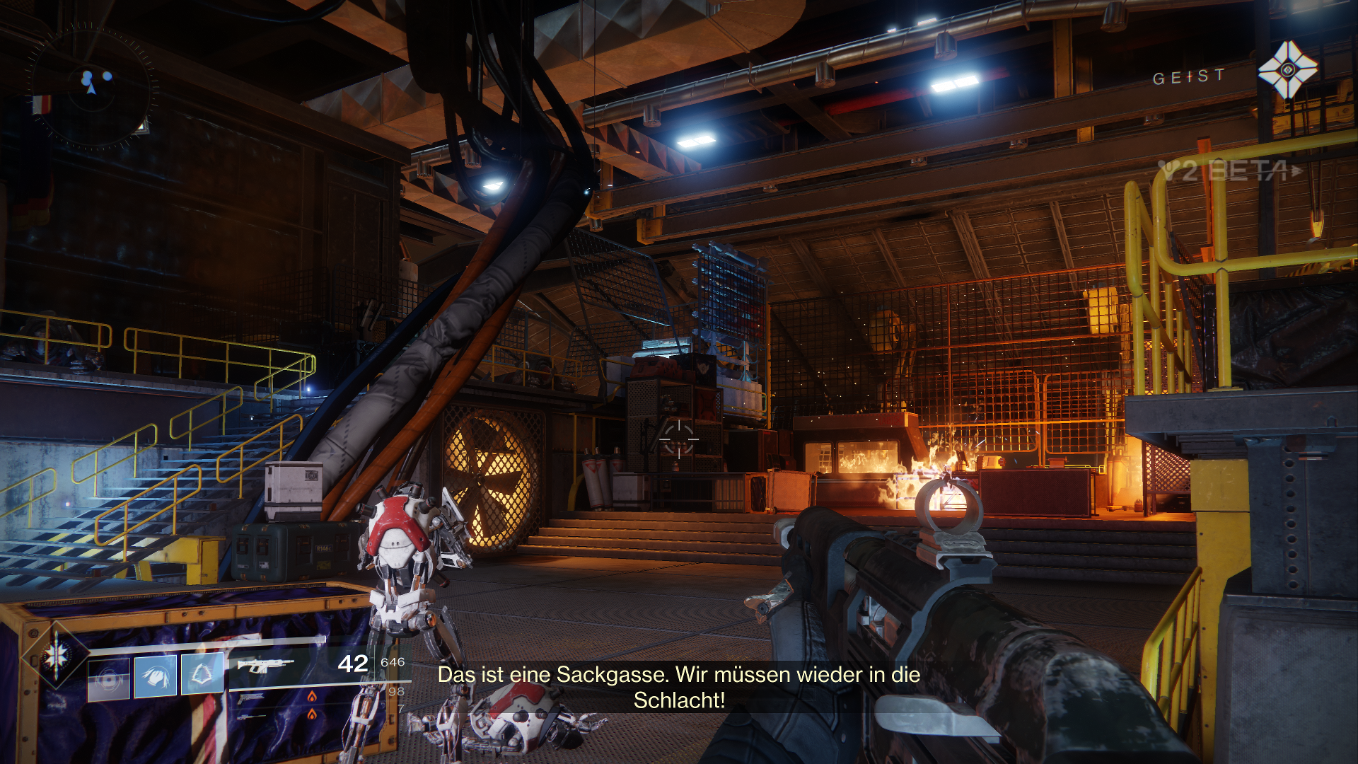 Startet man die Beta, kommt man erst einmal in den Start-Screen und darf sich eine der drei bekannten Klassen aussuchen. Neue gibt es nicht. Ich, für meinen Teil, habe den Jäger genommen. Dann fängt direkt die erste Story-Mission inklusive aller finalen Zwischensequenzen an. Nach den Sequenzen steht man in der brennenden Halle der Vorhut und muss erst einmal einen Weg hinaus suchen.